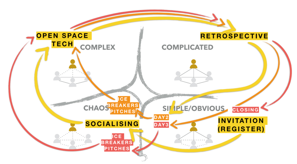 The call for facilitators for the next day indicates a shift back into “simple” mode. This closes each cycle and repeats twice until the event concludes. This cyclical process aligns with principles of Agile Systems Dynamics or the Cynefin learning loop, emphasizing continuous adaptation and learning.
